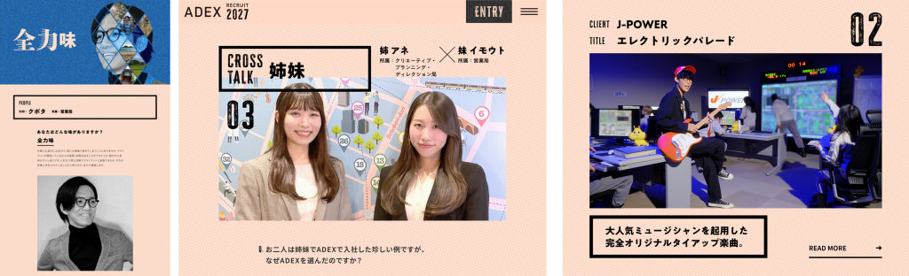 ADEXは総合広告会社として、クライアントの課題解決を目的に、戦略立案からクリエーティブ、メディア、PR、プロモーションまで幅広いコミュニケーション活動を支援しています。採用サイトでは、実際のプロジェクトや社員の仕事を紹介しながら、広告会社の仕事の面白さを伝えています。