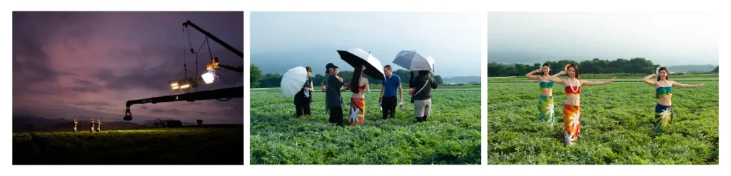 今回の新TVCM撮影は、蒟蒻の生育に合わせて8月初旬に実施しました。朝日を背景にした美しいシーンを収めるため、スタッフは午前2時に現場へ集合し、夜明けとともに撮影を開始。日中は厳しい暑さの中での撮影となりましたが、スパリゾートハワイアンズのダンサーの皆さまは終始笑顔を絶やさず、完璧なフラダンスを披露してくださいました。撮影は夜明け前から日没後まで長時間にわたって行われ、蒟蒻畑の魅力とダンサーの躍動感が融合した、印象的な映像が完成しました。