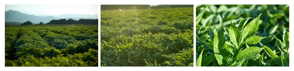 群馬県内のロケ地では、太陽の光を浴びて輝く蒟蒻の葉が、夏ならではの美しい景観をつくり出していました。