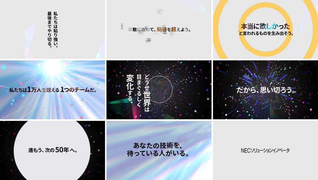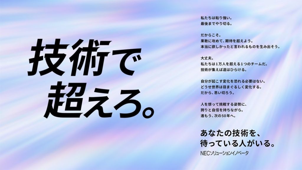 ADEXからの初期提案では『あなたの技術を、待っている人がいる。』というコピーをメインとして提示。このコピーはご評価を頂いたものの、より背中を押し、鼓舞するものとして『技術で超えろ。』をメインに据える表現にたどり着きました。あなたの技術を、待っている人がいる。だから技術で超えろ。そんな構造のキーメッセージとボディコピーを、NECソリューションイノベータの皆さんと一緒につくりあげていったのです。