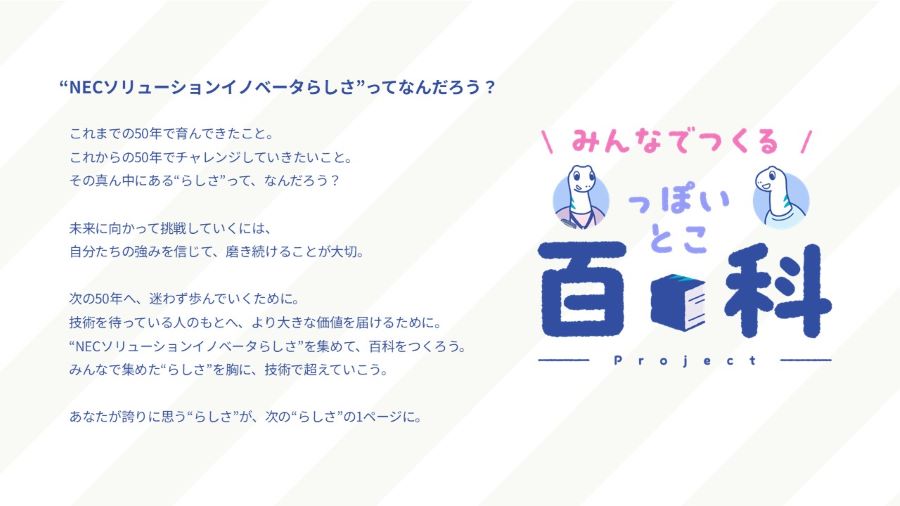 まず取り組んだのは、社内の“あるある”を「NECソリューションイノベータっぽいとこ」と称し、ネタを募集して社内限定の特設サイトで紹介する「っぽいとこ百科」です。