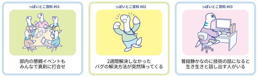 募集したあるあるに対するいいねボタンを設置し、社員からの投票を募りました。票を多数獲得した人気のネタは、「ネッスー」というオリジナルキャラクターでイラスト化し、特設サイトで公開。当初イントラ掲載のみを想定したPDF制作でしたが、ご好評を頂き社内配布用の冊子として印刷を行うまでに発展しました。これは2025年9月9日の50周年イベントで配布され、多くの社員の手に渡ることに。自由な社風や技術者特有のエピソードなど、今まで可視化されていなかった独自のカルチャーが、多くの共感を呼ぶコンテンツとして具現化しました。