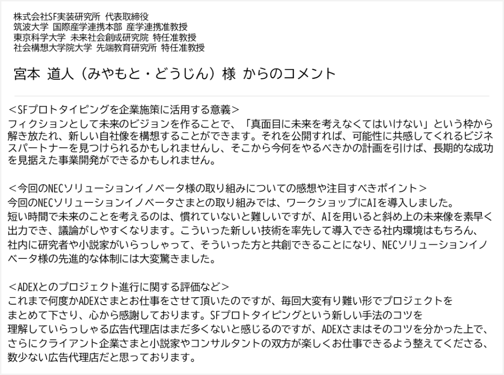 ワークショップだけでは、深い議論はできても拡散は限定的です。だからこそ物語という形式にすることで、構想段階の技術やサービスが“語れる資産”となり多くの方へ広がっていきました。研究と創作という異なる強みを掛け合わせることで、ワークショップで生まれた構想をただのアイデアで終わらせず、より具体的な未来像として描くことができます。