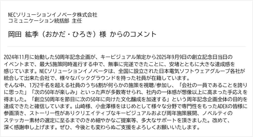 結果として、イベントの参加者アンケートでは「ムービーに心が躍った」「50周年のキャッチコピーのムービーがとても力強くわかりやすく、良かった」など数々の前向きなコメントをいただきました。