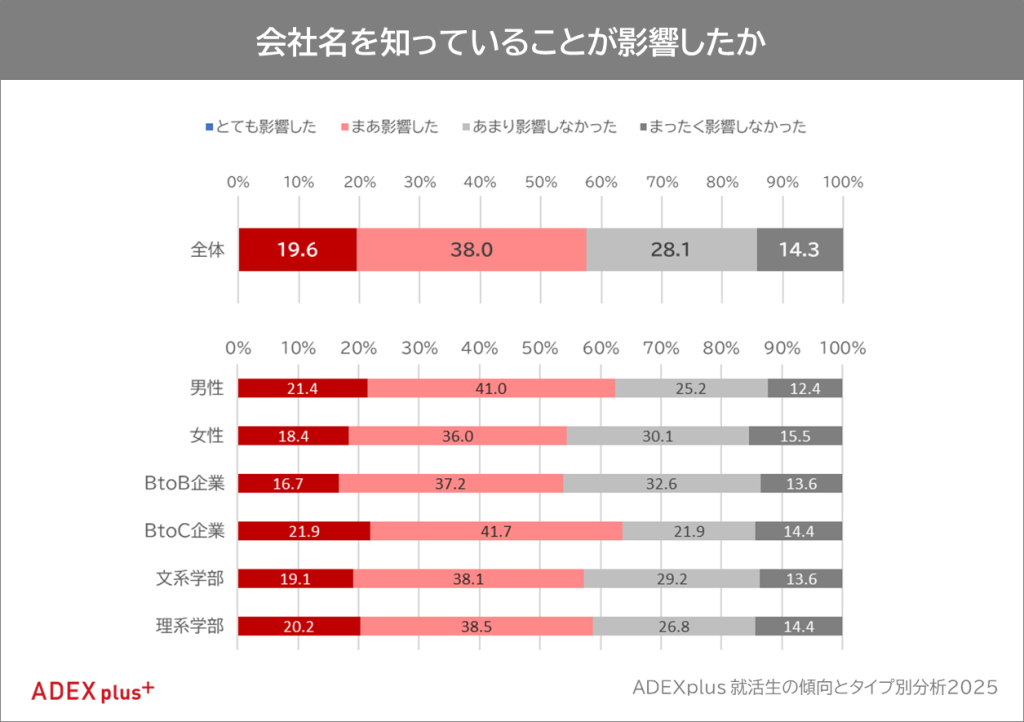 調査結果によると、「とても影響した」が19.6%、「まあ影響した」が38.0%と、合計で57.6%、約6割の学生が企業の知名度が就職活動に影響を与えたと回答しています。このことから、企業の知名度が学生の企業選びにおいて大きな要素となっていることがわかります。